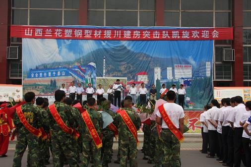 舉世震驚的四川汶川8.0級大地震發(fā)生后,蘭花集團在第一時間作出反應(yīng),公司全體員工發(fā)揚“一方有難、八方支援”的精神,積極捐款捐物達560多萬元,在全市率先交納特殊黨費88萬余元,以實際行動全力支持抗震救災(zāi),幫助災(zāi)區(qū)人民重建家園。特別是援建災(zāi)區(qū)過渡安置房建設(shè)任務(wù)下達后,公司領(lǐng)導高度重視,將支援災(zāi)區(qū)重建作為首要任務(wù)和頭等大事。蘭花塑鋼公司推掉一卻對外銷售任務(wù),在保證質(zhì)量的前提下,加班加點快速生產(chǎn)。由39名勇士組成的安裝突擊隊,于6月9日、15日帶著所有蘭花人的重托,懷著對災(zāi)區(qū)人民的深厚情誼,趕赴災(zāi)區(qū)。與其他各路大軍一起參加災(zāi)后重建,在30多天時間里,共安裝過度房門窗3435套,至7月16日,突擊隊圓滿完成了安裝任務(wù),于20日上午8點從災(zāi)區(qū)啟程凱旋。
