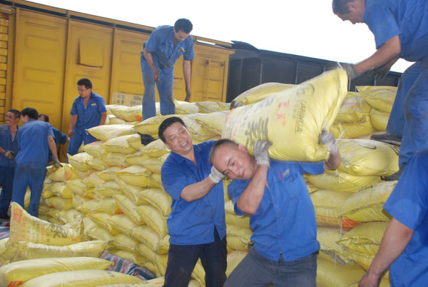 7月4日中午,該廠又召開緊急會議,從12個生產(chǎn)車間抽調(diào)200多人組成8個裝車突擊隊,到晉城北站東貨運站解圍。每個突擊隊承包一節(jié)車皮,需要和原裝卸隊共同完成800噸的裝車任務。下午2時,廠長李虎、工會主席張向陽、生產(chǎn)廠長呂紀烈、經(jīng)營廠長王志強冒雨火速趕到現(xiàn)場,與銷售站和基層車間的干部員工并肩作戰(zhàn),一起裝運尿素。前來裝尿素的員工用手抬,用肩扛,揮汗如雨,一聲不哼的當“搬運工”!干累了,喘口氣,喝口水,接著又干。這些“搬運工”中,有廠部領導、中層干部,有年近花甲的老人、有剛參加工作的大學生,有上白班的維修工、有倒松班從家趕來的操作工。在這里沒有高低之分,沒有大小之別,有的就是盡快裝車,把產(chǎn)品運出去。雖然大家都是沒有出過苦力氣的“文人”, 但是黨員干部任勞任怨、樂于奉獻的精神無不鼓舞著在場的每一個人。經(jīng)過3個小時的艱苦勞作,8個突擊隊圓滿完成了裝車任務。看著碼放齊整的尿素車皮封廂的一剎那,大家終于長長的松了一口氣。此時的勞累已被減輕庫存壓力、降低周轉(zhuǎn)資金的幸福所掩蓋,雖累但累有所值。