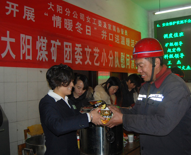 近日,大陽礦工會女工委組織安全協(xié)管員及家屬到井口開展為期一個月的“情暖冬日 囑安全”慰問活動。女工協(xié)管員們精心準備了熱氣騰騰的紅糖姜水、奶茶、咖啡、羊湯深入井口遞到一線員工手中,家屬們親自為一線職工縫衣釘扣,文藝小分隊還在井口表演文藝節(jié)目?;顒幽哿寺毠兊男?,調動了職工的工作積極性。(宋芳)