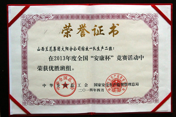 本網(wǎng)訊 日前,大陽煤礦綜放一隊(duì)生產(chǎn)二班榮獲“2013年度全國‘安康杯’優(yōu)勝班組”榮譽(yù)稱號(hào)。