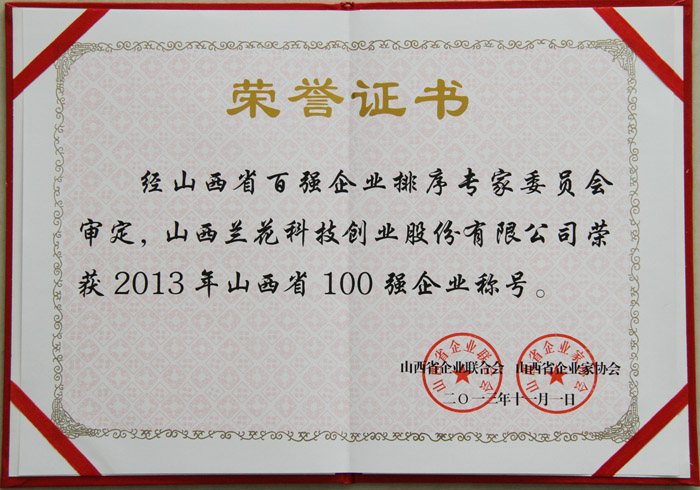 2013年11月,公司榮獲2013年度山西省100強(qiáng)企業(yè)稱號(hào)