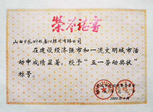 2000年4月,榮獲市總工會(huì)頒發(fā)的五一勞動(dòng)獎(jiǎng)狀
