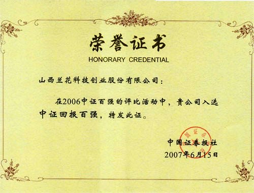 日前,由證券時(shí)報(bào)社、中聯(lián)集團(tuán)聯(lián)合主辦的“2006年度中國(guó)上市公司價(jià)值百?gòu)?qiáng)”結(jié)果揭曉。晉城市唯一的上市公司--山西蘭花科技創(chuàng)業(yè)股份有限公司,繼4月份以第三位的成績(jī)榮獲“中國(guó)漂亮50”后,又獲得了中國(guó)上市公司價(jià)值百?gòu)?qiáng)的第三十二名,其中業(yè)績(jī)?cè)u(píng)價(jià)獲第十一名。