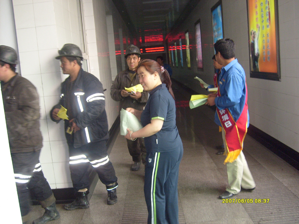望云分公司礦領(lǐng)導(dǎo)現(xiàn)場發(fā)放環(huán)保宣傳資料