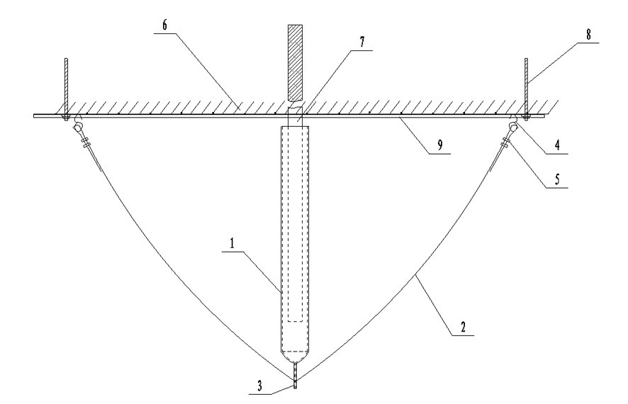 圖中:1-套管,2-鋼絲防抖繩,3-連接板,4-金屬鉤,5-鋼絲繩卡,6-頂板,7-錨索,8-錨桿,9-鋼帶。