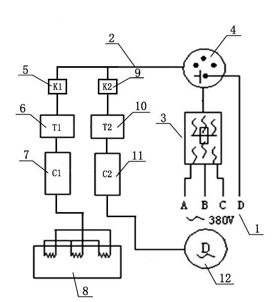 如圖所示,一種機(jī)車水溫自動(dòng)加熱裝置,包括三相四線外接電源1,三相四線外接電源1通過(guò)電纜線2連接空氣斷路器3,空氣斷路器3通過(guò)電纜線2連接三相四線制專用插座4,三相四線制專用插座4的輸出端分兩路:一路通過(guò)電纜線2連接第一控制電路開關(guān)5,第一控制電路開關(guān)5通過(guò)電纜線2連接第一水溫繼電器6,第一水溫繼電器6通過(guò)電纜線2連接第一交流接觸器7,第一交流接觸器7通過(guò)電纜線2連接電加熱器8;另一路通過(guò)電纜線2連接第二控制電路開關(guān)9,第二控制電路開關(guān)9通過(guò)電纜線2連接第二水溫繼電器10,第二水溫繼電器10通過(guò)電纜線2連接第二交流接觸器11,第二交流接觸器11通過(guò)電纜線2連接水泵12。