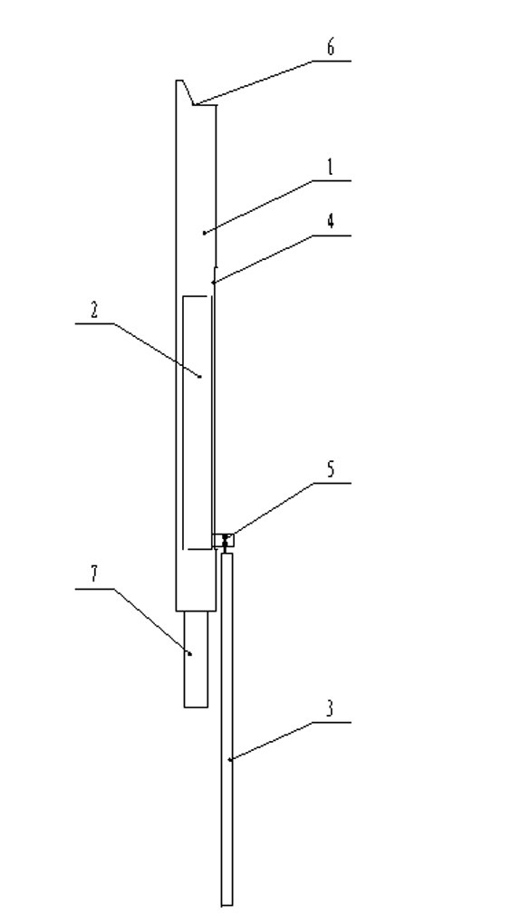 本實(shí)用新型所述的一種頂板錨固劑安裝器,包括安裝槽1、頂桿2和操縱桿3,所述的安裝槽1側(cè)面開(kāi)有推拉槽4,頂桿2裝入安裝槽1內(nèi)部,頂桿2底部側(cè)面裝有從推拉槽4穿出的連接銷(xiāo)5,操縱桿3在安裝槽1外部并與連接銷(xiāo)5連接,安裝槽1頂部開(kāi)有切口6。其中,安裝槽頂部切口6截面為梯形,安裝槽側(cè)面推拉槽4為長(zhǎng)方形。