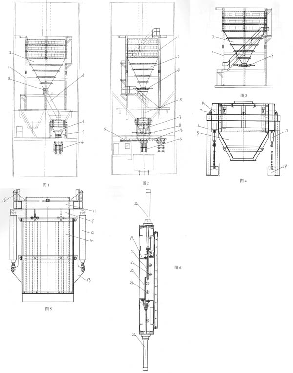 具體實(shí)施時(shí),緩沖倉(cāng)2和定量倉(cāng)3的倉(cāng)容分別為100t和5t;裝車(chē)溜槽4包括筒狀內(nèi)溜槽9、和套于筒狀內(nèi)溜槽9外的筒狀外溜槽10,筒狀內(nèi)溜槽9上部設(shè)置有與鋼結(jié)構(gòu)框架1固定的支撐架11,支撐架11下方筒狀外溜槽10兩側(cè)對(duì)稱吊置有受控制裝置控制的提升油缸12,提升油缸12的缸體尾端與支撐架11固定,提升油缸12的活塞端部通過(guò)連接件13與筒狀外溜槽10連接固定;另外,為避免阻礙裝煤車(chē)廂的牽引機(jī)車(chē)通過(guò),鋼結(jié)構(gòu)框架1固定裝煤溜槽4處設(shè)有滑軌14、以及水平放置的受控制裝置控制的推移油缸15,裝車(chē)溜槽4的支撐架11上設(shè)有能沿滑軌14移動(dòng)的滑輪16,推移油缸15的缸體尾端與鋼結(jié)構(gòu)框架1固定,推移油缸15的活塞端部經(jīng)連接件與裝車(chē)溜槽4的支撐架11連接固定。當(dāng)裝煤機(jī)車(chē)行至跨線筒倉(cāng)時(shí),推移油缸15將裝車(chē)溜槽4從定量倉(cāng)3正下方推移至旁邊,當(dāng)機(jī)車(chē)通過(guò)后,再次將推移油缸15將裝車(chē)溜槽4推移至定量倉(cāng)3正下方(即裝煤車(chē)廂正上方),然后,通過(guò)兩臺(tái)提升油缸12將裝車(chē)溜槽4上升或下降至裝車(chē)時(shí)的最適宜的位置上,在定量倉(cāng)3放煤閘門(mén)8打開(kāi)后,實(shí)現(xiàn)煤炭向車(chē)廂內(nèi)的裝入,同時(shí)在車(chē)廂行進(jìn)中平煤。